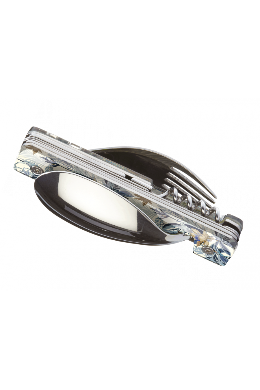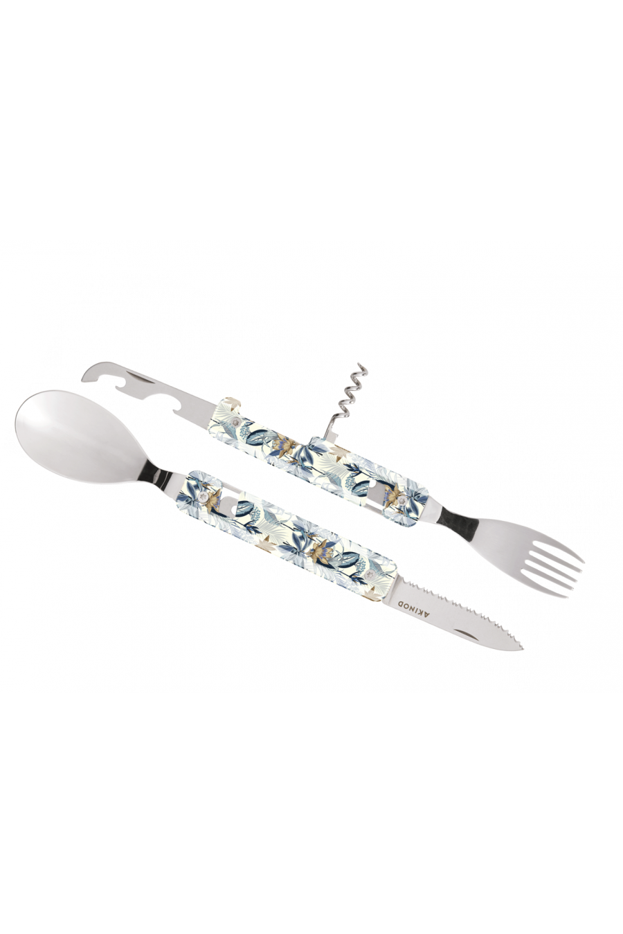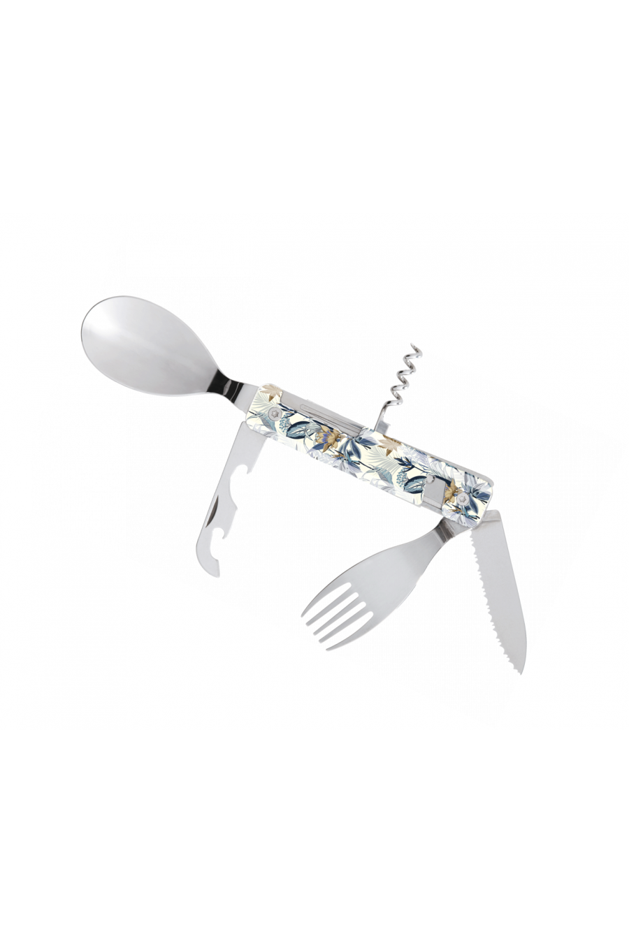 Il est composé d'un couteau à lame micro dentée, d'une fourchette à 5 dents, d'une cuillère, d'un tir bouchon 4 spirales, d'un ouvre boite et d'un décapsuleur. Le tout s'assemble d'un clic grâce aux aimants intégrés. Il ne vous reste plus qu'à choisir le décor !