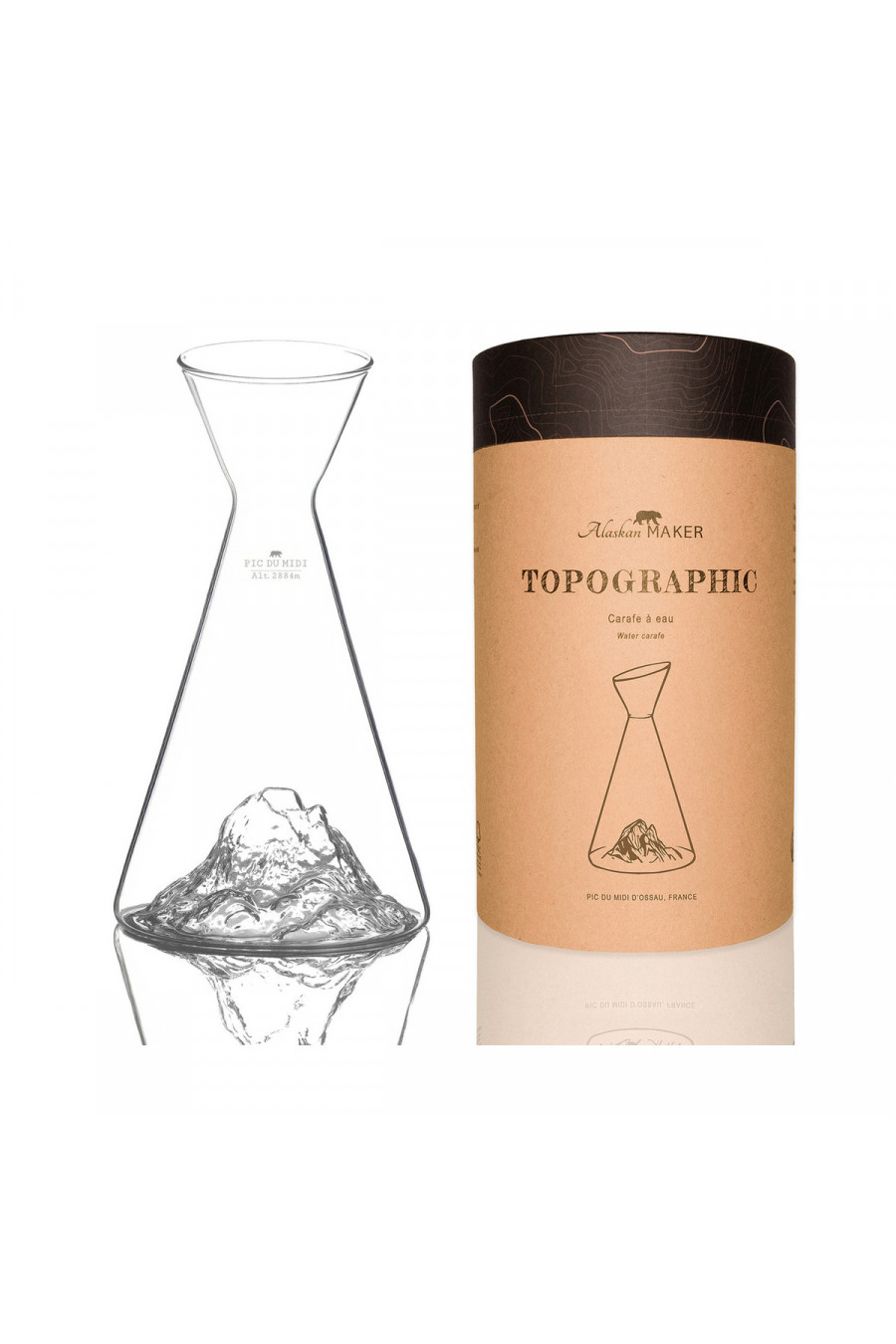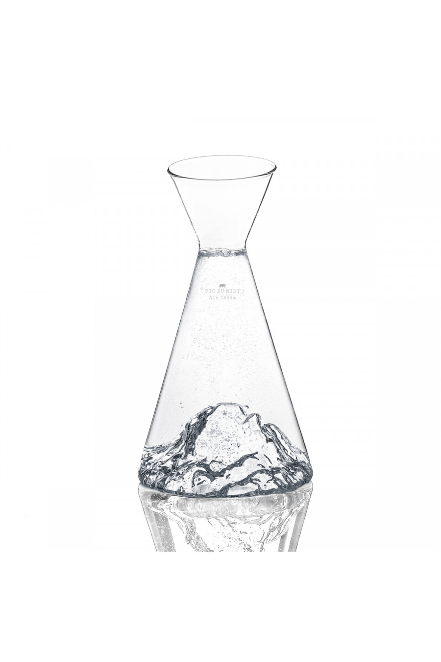 Carafe à eau en verre cristallin, fond en relief topographique avec le sommet du Mont Blanc, large goulot pour servir facilement.